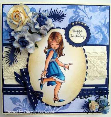Oh wowzer Tracy this is absolutely gorgeous what wonderful shades of blue and so love how you have coloured the image, beautiful card.