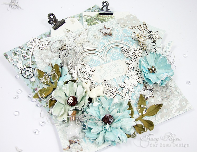 I made a wintery card. I started by using cutting the Pion Design Winter Wonderland papers. I then used the 13arts wallpaper stencil, mixed some Dutch Doobadoo structure paste with some Tury Design paint in blue and applied to the stencil in a couple of places on the Pion Design paper. It dries matt finish and just soooo beautiful.